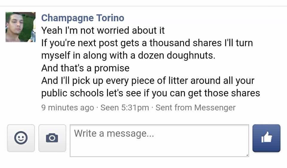 Zaydel 還說在自首時會帶一打冬甩給警方,又指願意為所有公立學校清理垃圾,睇死警方的帖子無法獲得過千轉發。怎知道雷德福德警方將 Zaydel 囂張的私訊 Cap 圖片貼在 Facebook,又說「冬甩!!!他應承帶冬甩給我們!你知道我哋有幾鍾意冬甩啦!」。Zaydel 給警方的挑戰,網民超額完成,該帖子最後獲得 4 千多次轉發。