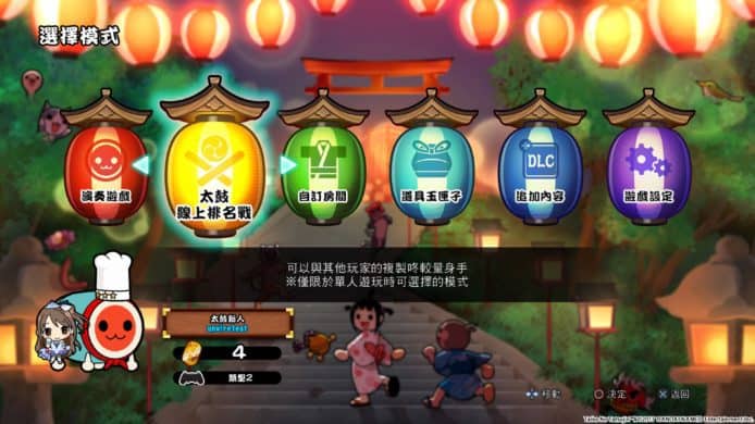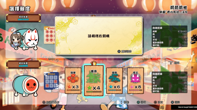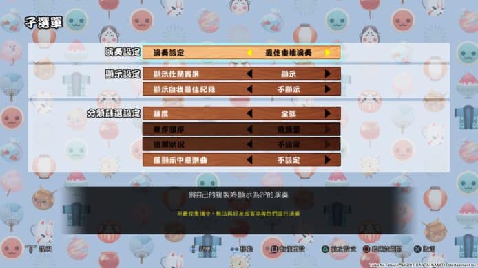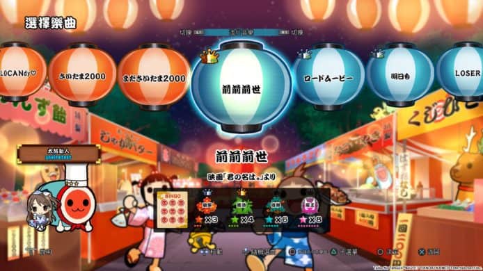 一如以往有4款難度可選,「簡單」、「普通」、「困難」、「魔王」。但要留意難度底下的星星數量,有些曲目的魔王難度都只是4粒星,有些普通級就已有7粒星,大家挑選時要留意啊。而部分歌曲有超越魔王難度的最高高高難度「裏譜面」,自問太鼓高手可以一戰!