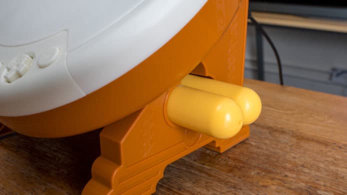 太鼓外型不錯,米黃鼓與橙色鼓座,襯返太鼓色調。鼓不算太大,當裝飾品放在家中也可以。太鼓鼓面下緣配有兩組十字鍵及五顆圓形按鍵,與手掣上的按鍵完全一樣,完全可以當手掣使用。鼓棍上面刻有“太鼓之達人”及兩個咚的圖樣。鼓下更有設計空位,以便收藏鼓棍,大頭蝦的玩家就不怕不見鼓棍了。太鼓和鼓棍都相當輕巧,記者是小女生也能輕易舉起。用法和在機鋪打的太鼓基本相同,只是外型變得迷你,小朋友一樣玩得!
