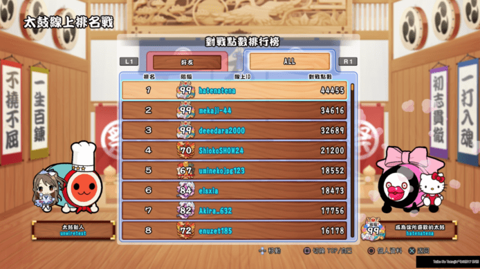 「太鼓線上排名戰」模式:與全球玩家線上的紀錄進行排名戰,須網路連線方可進行,以不停對決,提高排名為目標!首先進行五場階級審核戰來判定玩家實力,再隨機對決同階級的玩家演奏過的曲目,勝出會獲得獎牌和對戰點數,繼而提升排名。