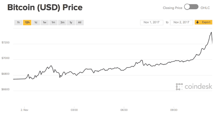 根據虛擬貨幣資訊網站 Coindesk 的數據,在美國時間 11 月 2 日早上 10 時 08 分左右,升穿了 7,000 美元大關,之後再繼續大幅攀升,最高更見 7351.46 歷史高位。在本文截稿時(香港時間11月2日晚)雖然下調至 7007.08,似乎有大幅波動之勢,但在幾日前甚至昨日購買 Bitcoin 的大好友已經有斬獲。根據虛擬貨幣市場資訊網站 Coinmarketcap 資料,在最近 7 日來 Bitcoin 幣值已經上升 22.33%。
