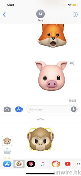 要玩Animoji,首先要開啟iMessage。選擇對象並打開輸入列,就可以看見下方有一個猴子圖像,按入去即可製作Animoji。