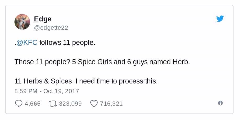 早前一名外國網民 Mike Edgette 破解了肯德基家鄉雞(KFC)的一個小秘密,他發現 KFC 的官方 Twitter 帳號只最追蹤了 11 個人,當中 6 名姓 Herb 的男生和 5 名前 Spice Girls 的成員,恰巧就是 KFC 家鄉雞配方的 11 種香草和香料。