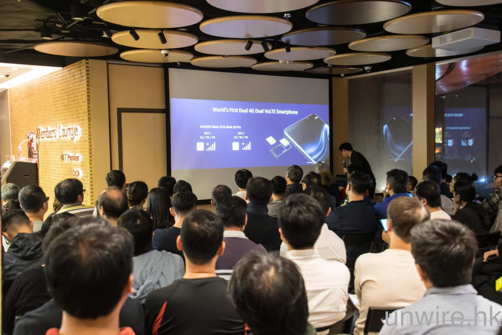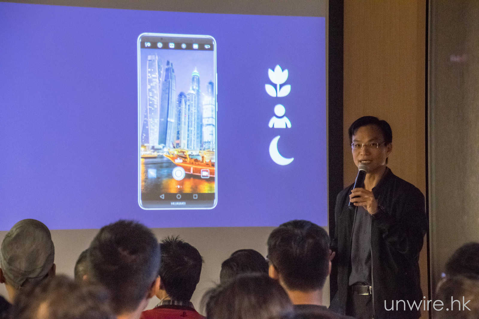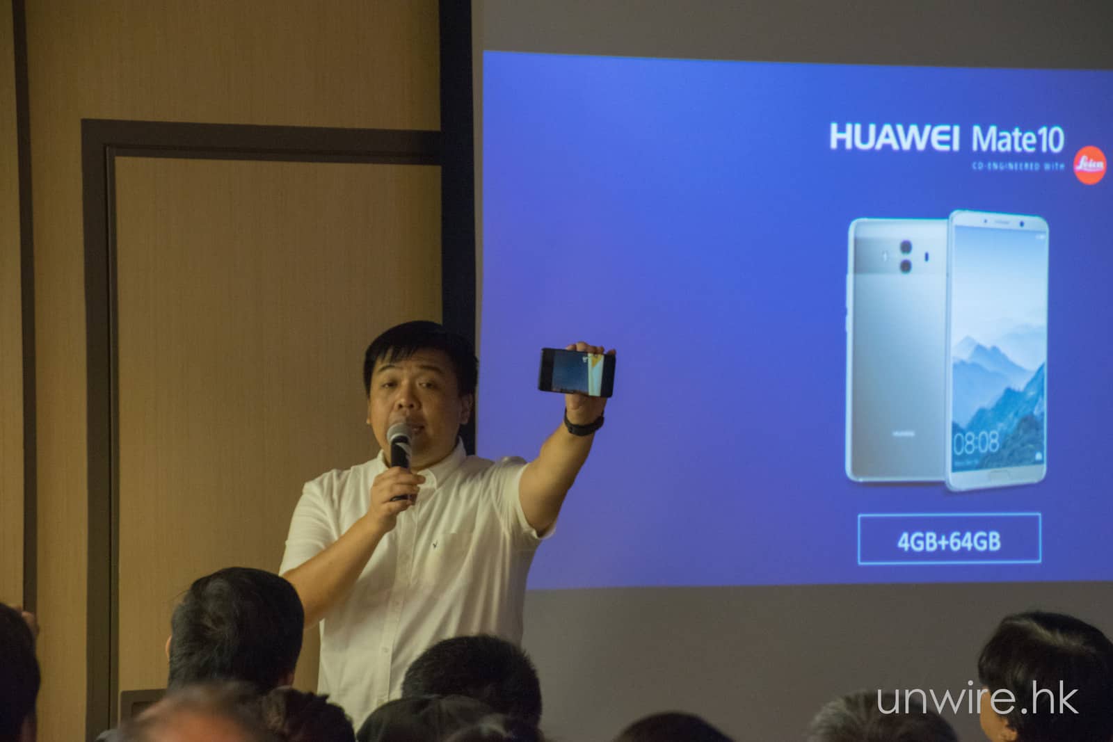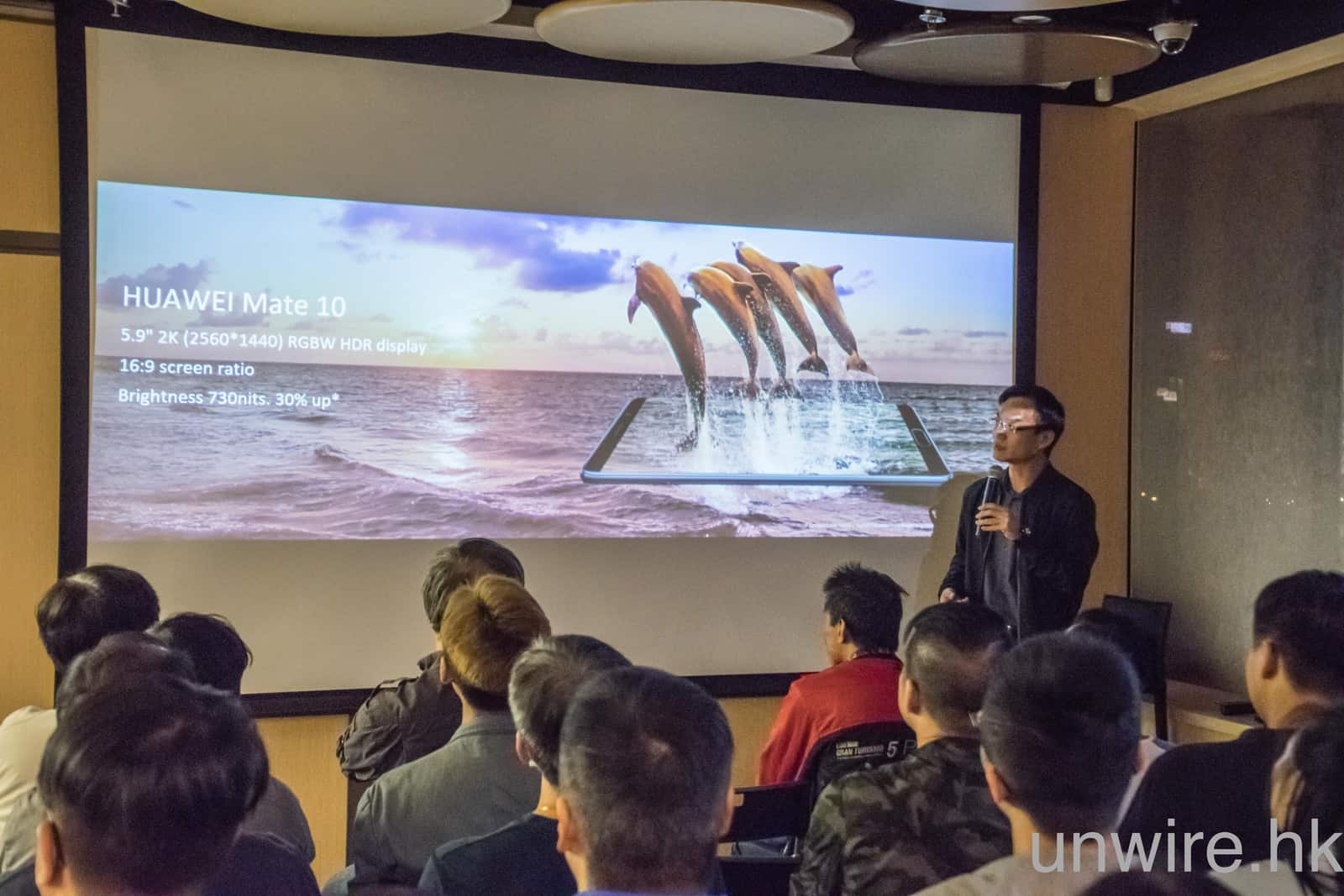 活動首先由華為代表 Alex 介紹新機的各項功能,Alex 首先介紹到 Mate 10 用上 5.9 吋 RGBW HDR 熒幕,解像度達 2K (2560×1440),而亮度更比上一代提升 30% ,務求令用家在手機上觀看影片時有更好的畫質體驗。