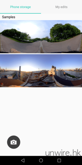 至於 APP 使用起來都很方便,只要接駁了 EnVizion 360,就可以使用了。一進入就是拍照介面,按一下攝錄機圖示就可以轉為拍片模式。當拍攝了相片後,進入相片瀏覽介面後,就可以在 4 種模式中選擇一種儲存,包括:Fisheye(魚眼)、Perspective(平面)、Crystal Ball(水晶球)及 Little Planet(小星球),當中最特別的肯定是小星球模式,因為不是很多 360 相機可將相片儲存為這個模式,這樣無論是身邊環境,甚至是天空、地面都可以合併為同一張相片,值得一讚!
