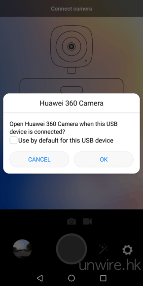 ▲進入 APP 後,可以見到左下角有一個相機圖示,點按它後再接駁 HUAWEI EnVizion 360 全景相機,再點按「OK」就可以開始拍攝了。