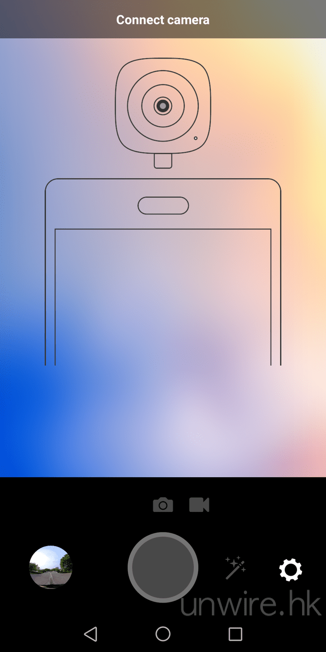 ▲進入 APP 後,可以見到左下角有一個相機圖示,點按它後再接駁 HUAWEI EnVizion 360 全景相機,再點按「OK」就可以開始拍攝了。