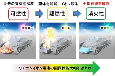 現時鋰電池使用可燃性有機電解液,會造成起火與爆發事故。而今次由日本東京大學為首的研究小組,就開發了一種全新電解液,由難燃性的有機溶劑以及電解質鹽造成,不會起火。而在溫度上升到攝氏 200 度時,電解液會變成蒸氣向四周擴散,可作為滅火劑。雖然電解液的成份不含可燃性有機溶劑,但同樣能夠令鋰離子電池、鈉離子電池進行充放電,長期充放電之下亦有滿意的效能安定性。