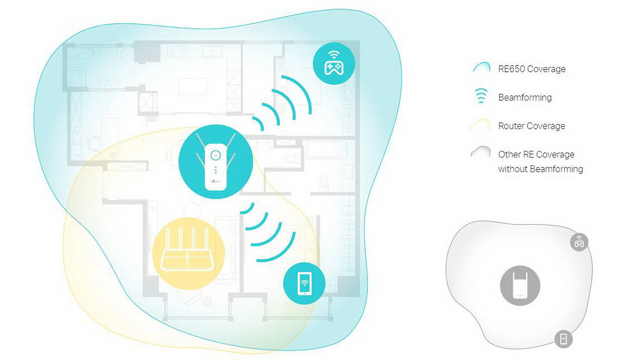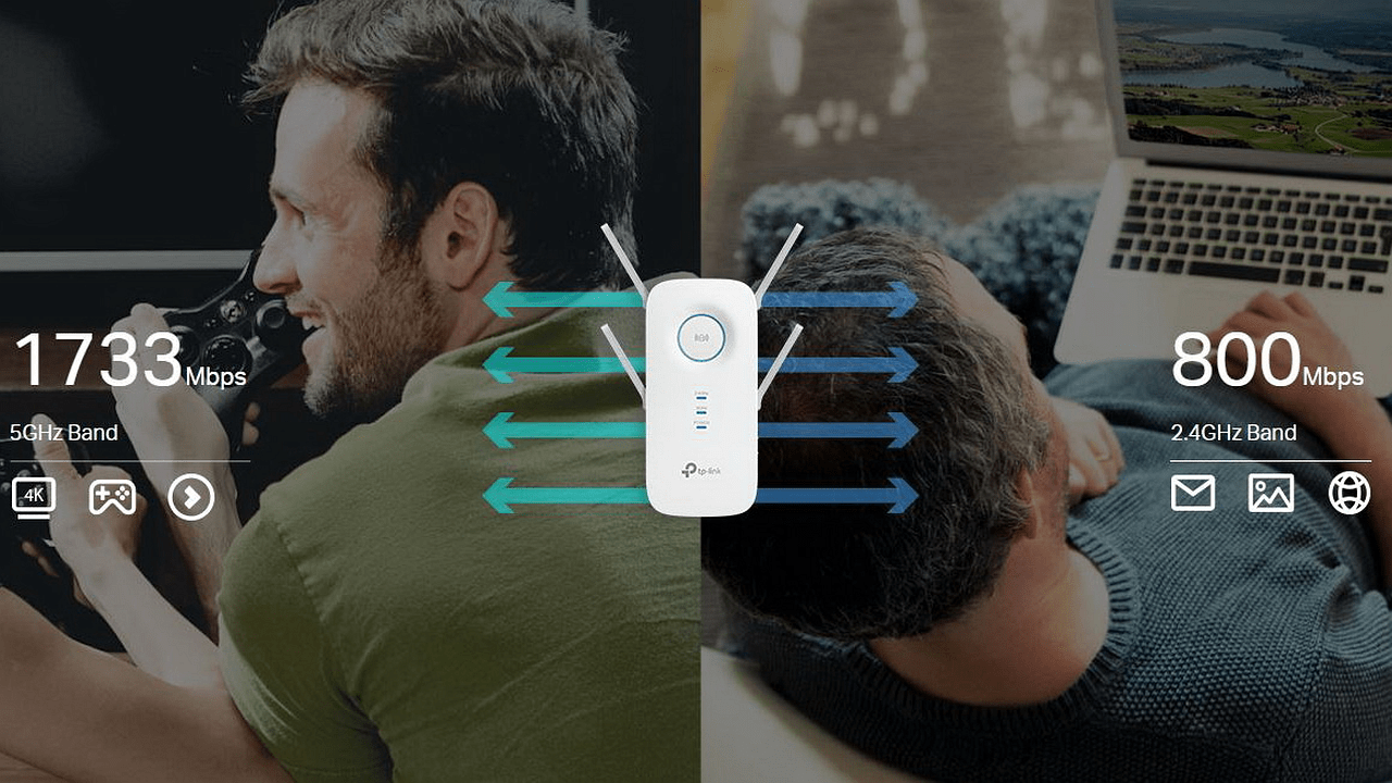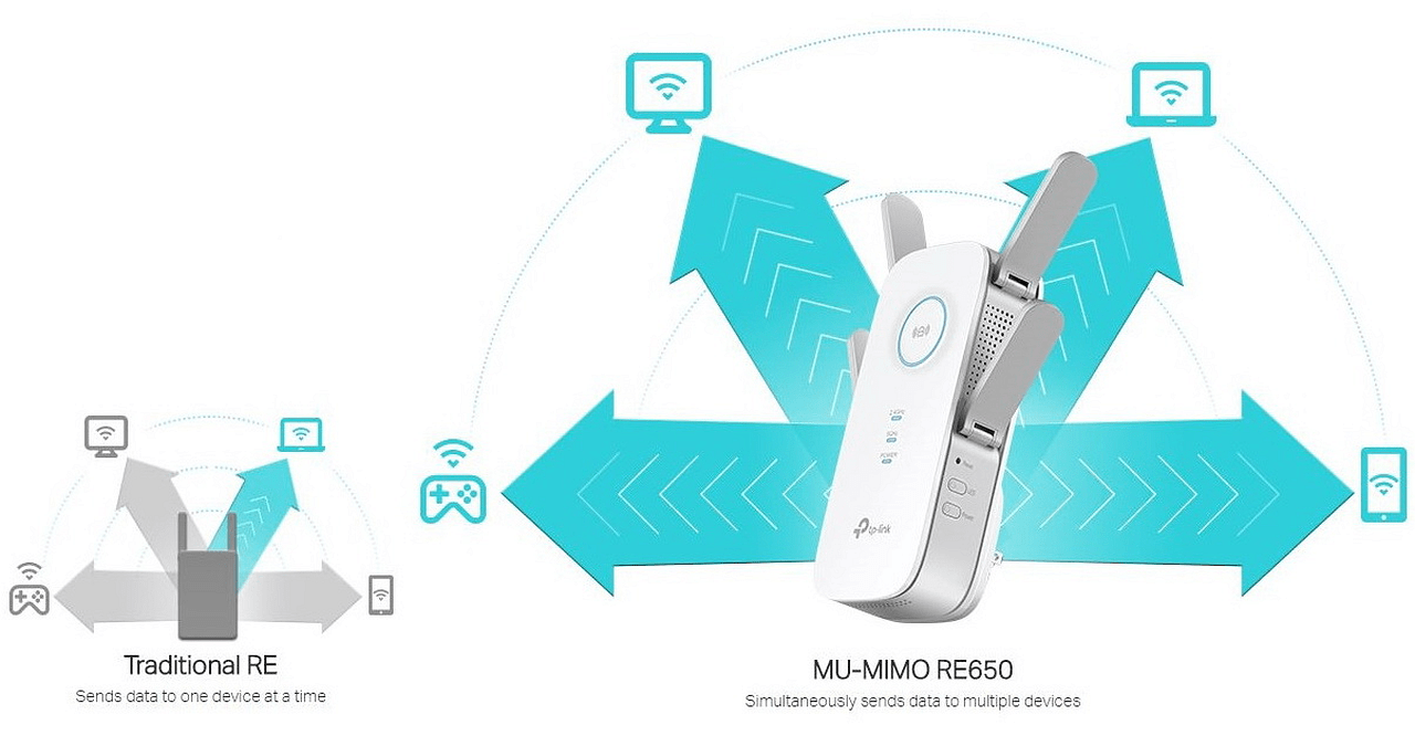 RE650 支援 Dual Band 制式,提供 1733Mbps@5GHz + [email protected] 高速無線傳輸。就算是 4K 串流、網上遊戲、大文件下載提供可靠而流暢的連接。而更會特別針對音樂及視頻串流、網上遊戲等資料得到優先處理,以確保提供流暢表現。加上最新 MU-MIMO 晶片,配合 4 條天線,能同時發出四個不同的信號,射向四台不同的設備,每台設備的傳輸可同時進行而不受影響。