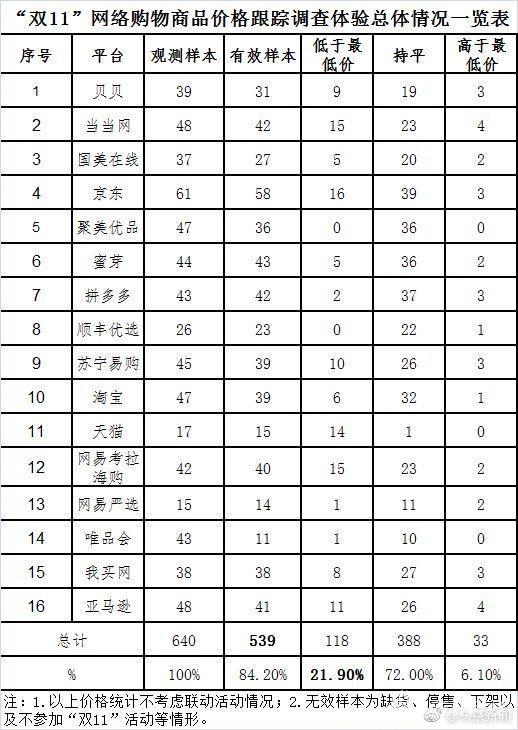中國消費者協會抽查了 16 個大陸消費者經常幫襯的網購平台,當中包括香港人熟悉的淘寶、天貓、亞馬遜、京東、國美、蘇寧等,監測有效的產品樣本 539 件,當中有 72% 的產品價格跟非雙 11 期間一樣,有 6.1% 甚至平時購買更便宜。協會已經不考慮推廣活動的優惠價,亦將缺貨、停售、下架、不參加雙 11 促銷活動的產品剔除,有 78.1% 產品並非真正雙 11 減價促銷,結果較 2016 年同樣的調查,百份比有所增加。