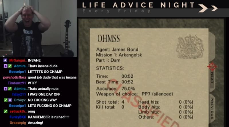 在《Golden Eye 007》第一關「Dam」是不少遊戲迷的挑戰目標,一直以來最快的成績就是有 Bryan Bosshardt 於 2002 年創下的 53 秒,這成績在過去 15 年都無人能夠打破,最多都是平手。日前玩家 Karl Jobst 直播挑戰遊戲時,竟然只需 52 秒就能過關,當畫面顯示結果是,Jobst 爆粗兼不敢置信。