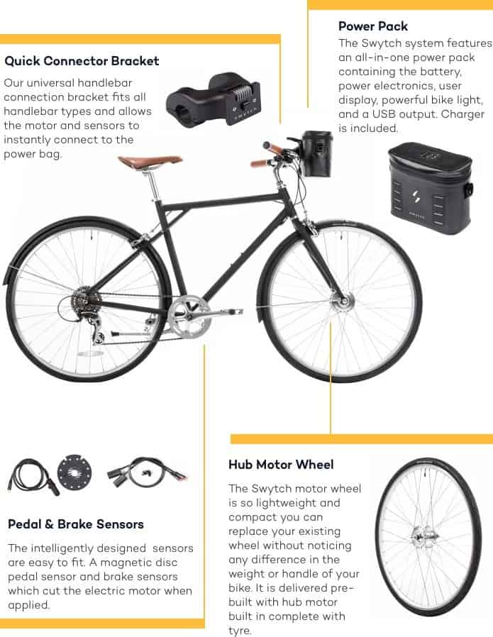 除了適合任何單車安裝,Swytch 的一大賣點是難以察覺。隱藏式設計電動摩打藏在前輪的中軸,至於電池則藏身於掛在單車手把的包包。驟眼看來比較像一個小巧的買菜籃,電池包還有電源顯示、車頭燈和 USB 輸出功能。Swytch 的另一賣點就是裝拆方便,只要將電池包扣好就能夠馬上運作,為用戶提供動力輔助。