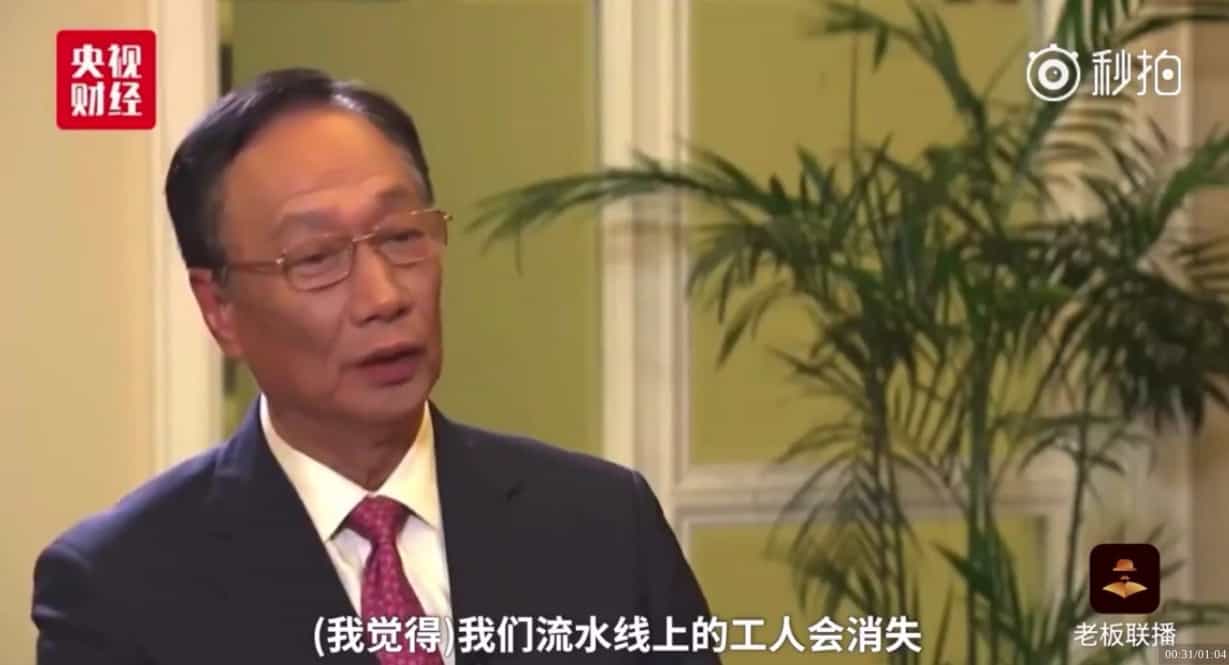 早前郭台銘接受中央電視台訪問時表示,雲端運算、移動裝置、物聯網、大數據、智能生活和網絡,加上機械人是互聯網年代最為重要。因為有了上述這些科技,未來 20 年有很多工種會因此消失,例如他們工廠生產線的工人,甚至是建築工人和銀行會計等。很多人的工作都會被科技取代,不過郭台銘認為哪些職業會消失並不重要,最重要是人要適應大環境的變化。
