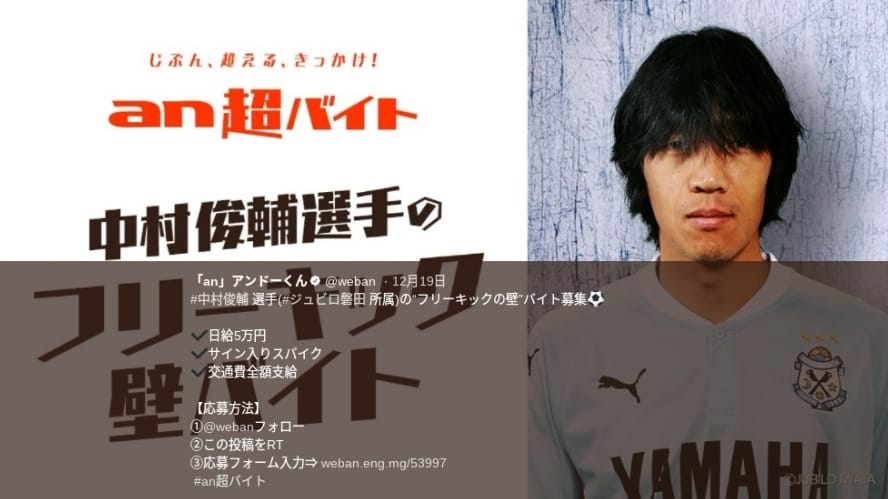 一如其他兼職一樣,「an」亦有表明應徵者所需的工作技能,不過今次這份兼職則毋須經驗或學歷,亦不論性別年齡。不過越高大或跳得越高,並且具有一定勇氣,相信會比較有利。兼職的上班日期為 1 月 11 日黃昏,地點為中村俊輔現時效力的 J-League 球隊磐田喜悅的訓練場地。報名者需要是日本人,由即日起到 1 月 2 日在「an」的 Twitter 帳號轉發貼文和填寫報名表格就有機會搵到筍工。