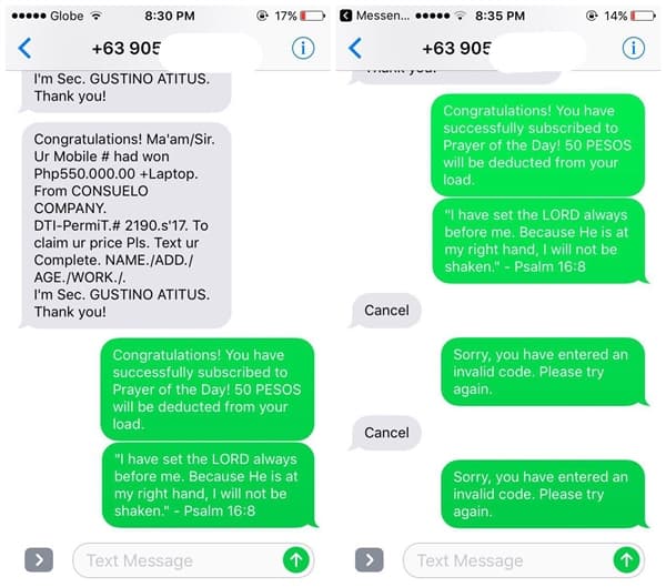 今次收到中獎短訊的 Gimao 決定反過來整蠱騙徒,於是傳回一個假扮系統的回覆訊息「恭喜!你已經訂閱每天聖經服務,費用 50 披索將會自動從工資戶口扣除」,之後再發送多一條聖經金句予對方。騙徒不虞有詐,以為自己真的訂閱了收費聖經服務,就馬上發短訊希望取消。