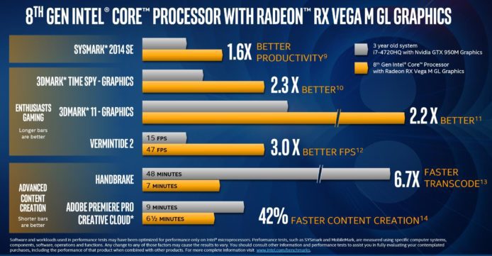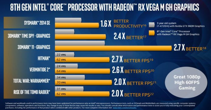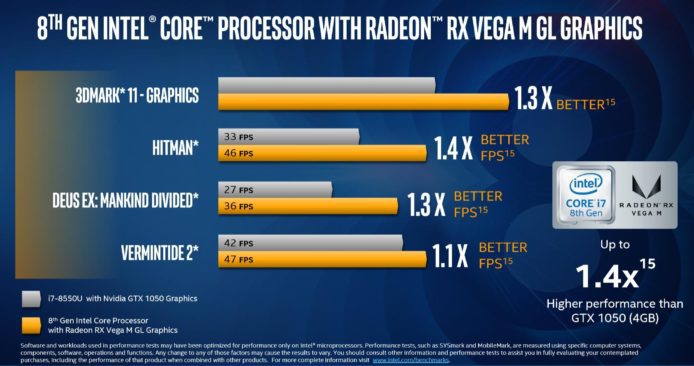 當中搭載 Vega M GL 晶片及第 8 代 i7 處理器的手提電腦,在運行部分遊戲時會比採用第 7 代 i7 處理器加上 GTX 1060 繪圖晶片的電腦快約 10%。證明搭載 Vega 的第 8 代處理器足以在高畫質配置的情況下,保持每秒 60 fps 的運行速度。