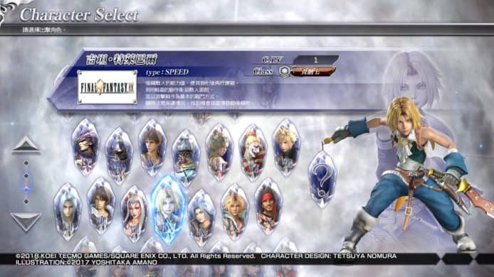 在對戰遊戲可選擇的角色當中,在未加入 DLC 之前就有總數 28 名。涵蓋歷代 FF,包括從 FF、FFII、FFIII 至到 FFXV,在PlayStation初代時經典的FFVII、FFVIII,以至到近代的FFXV,MMO版的 FFXI 同 FFXIV,還有 FFT、零式等都有角色參戰。不過看到角色陣容還有相當大的發展空間,選角大都以各集的主角、反派為主,睇怕 DLC 會有不少內容等著玩家。