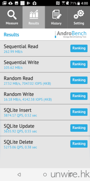 ▲至於內置儲存空間方面,以 AndroBench 測試,讀取速度只有 262.99MB/s,確實是慢了一點……