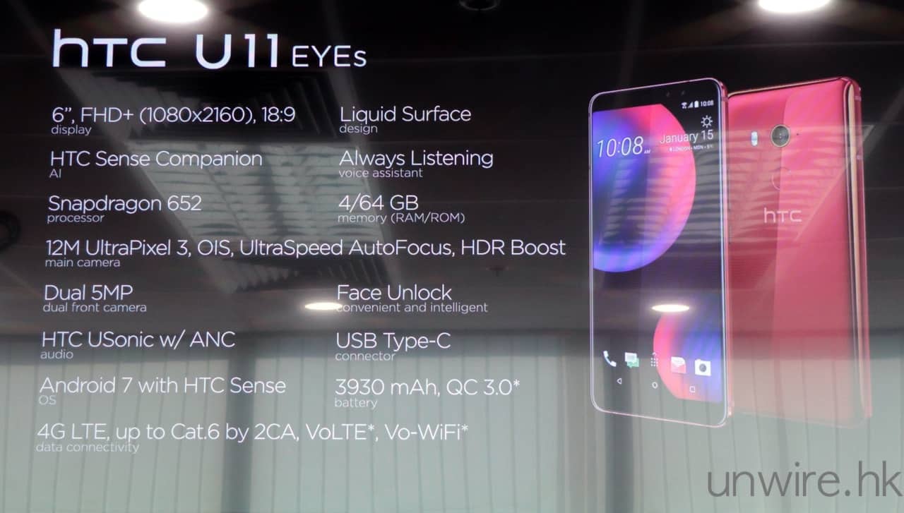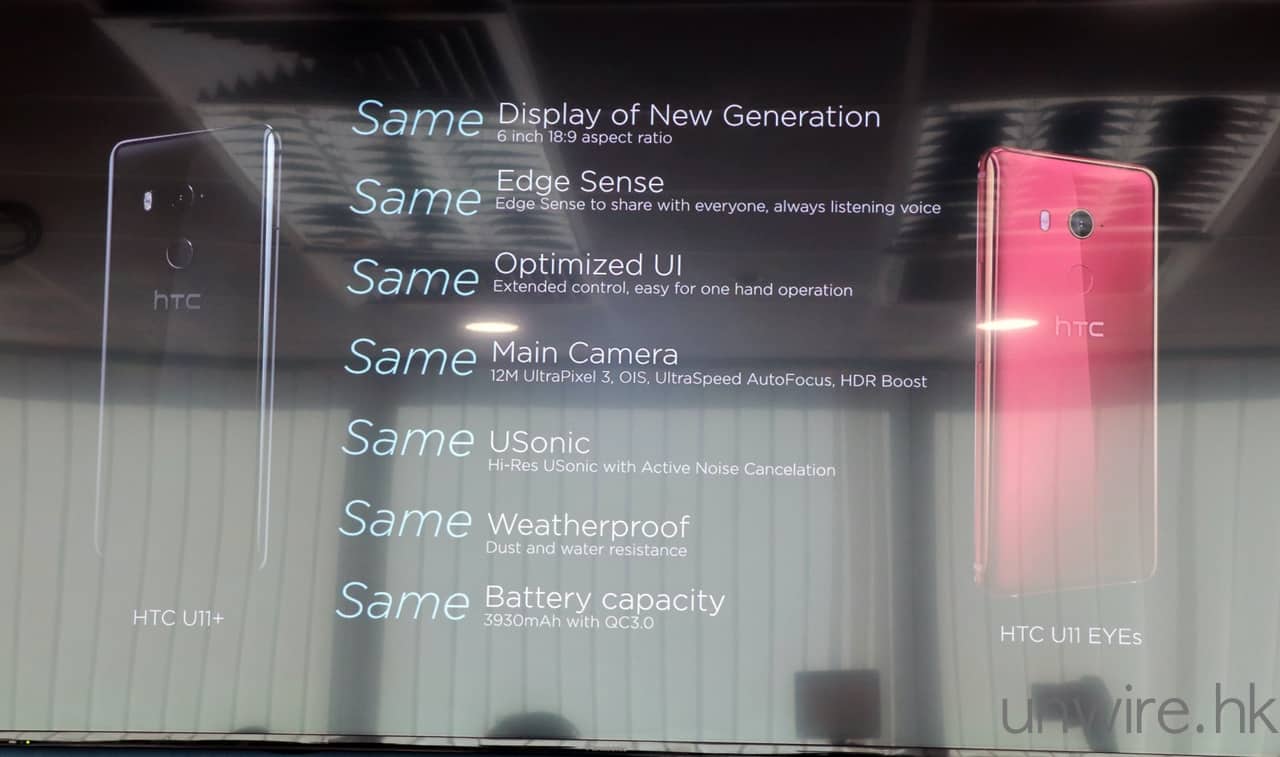 ▲根據官方表示,U11 EYEs 在多方面都與 U11+ 是一樣的,包括:熒幕尺寸、Edge Sense、UI、主鏡頭、USonic 耳機、防水防塵及電池容量。