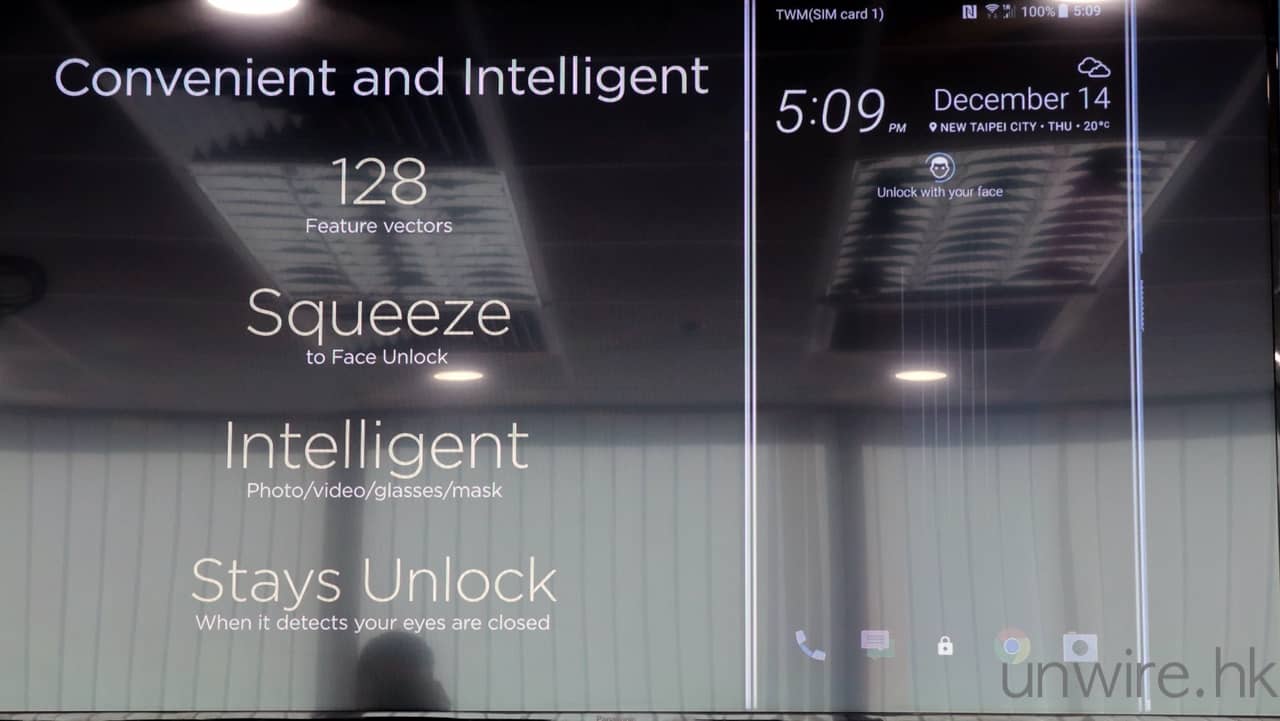 U11 EYEs 最大特別之處,其中一個就在於系統保安上加入了人臉辨識解鎖功能。可能大家會問:其實這功能很多手機都有,而且除了 iPhone X 外,其他的人臉辨識都是不太安全,有甚麼特別?其實 U11 EYEs 的人臉辨識,會在登記時將你臉上的 128 個特徵記錄在系統中,之後只要拿起手機,再將前置鏡頭對準自己就可解鎖。而相比一般的人臉辨識,它是比較安全的,即使大家用自己的相片或者有自己樣貌的影片對準鏡頭,甚至閉起雙眼都不能成功解鎖。不過由於仍不似 iPhone X 般擁有高安全度,所以仍然不能在付款時以它進行身份驗證,只能像以往般用指紋或密碼。