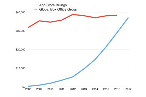 著名分析師 Horace Dediu 在 2015 年表示,iOS App Store 的銷售額已經超越了美國的票房數字。Dediu 日前發表了他的一些見解,按照 Apple 公佈的 2017 年度 iOS App Store 開發者收益達 265 億美元,Deidu 嘗試將 Apple 的佣金計算在內,估計在今年內 iOS App Store 的銷售額就會超越全球電影票房的數字。