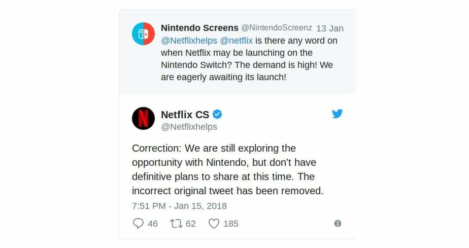 網民向 Netflix 的 Twiiter 發帖,表示有不少 Switch 用戶等待著 Netflix 功能,結果獲得官方回覆指,現時沒有計劃為任天堂 Switch 提供 Netflix 服務。正當網民以為得到失望的答案,怎料在 24 小時後,Netflix 竟然來一個 180 度轉變,特別修改回覆作出更正。Netflix 表示他們正在尋求和任天堂合作的機會,但現在沒有確切的計劃可以分享,他們撤回之前不正確的回覆。