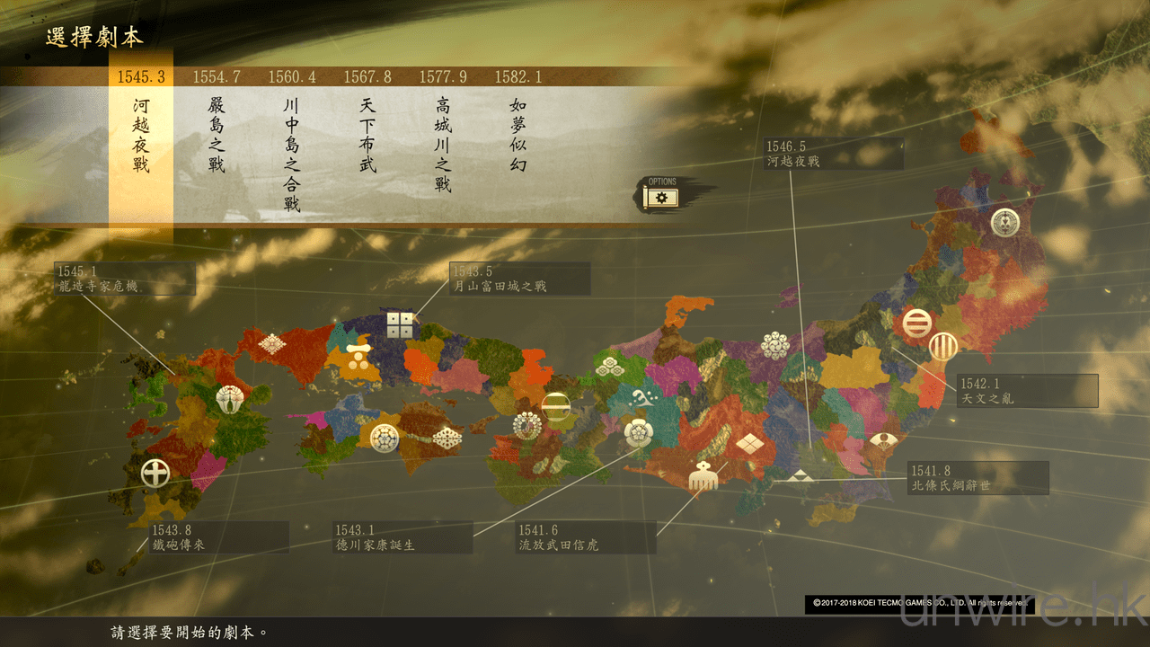 ▲普通版有 7 個劇本供大家選擇(典藏版會再多一個),提提對日本戰國歷史不太熟悉的用家,如果想由初期織田信長開始玩,就要由第二個劇本「嚴島之戰」開始玩起,因為第一個劇本「河越夜戰」,一開始時只能選擇他的老爹織田信秀開始,畢竟 1545 年 3 月信長只是一個 11 歲的「死靚仔」而已,要多玩兩年左右才行「元服禮」,正式成為武將之一。