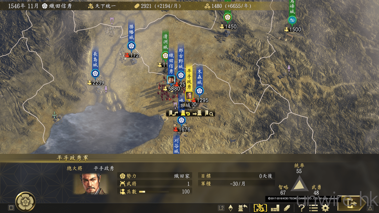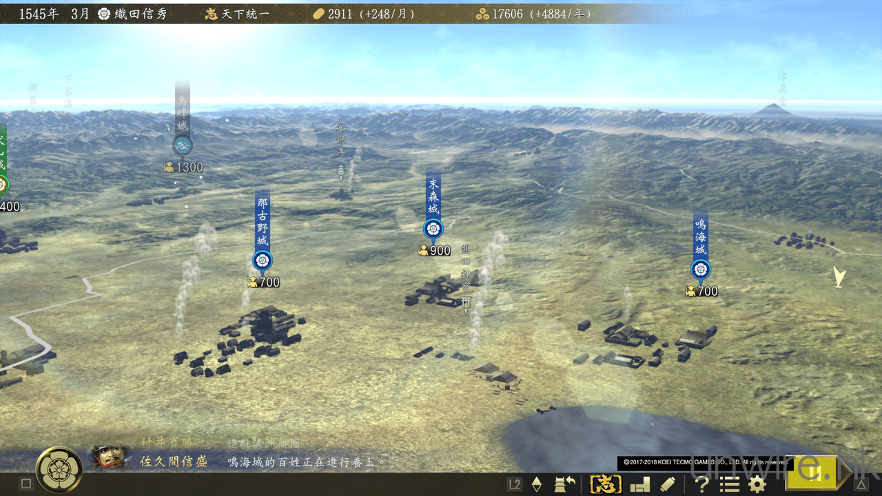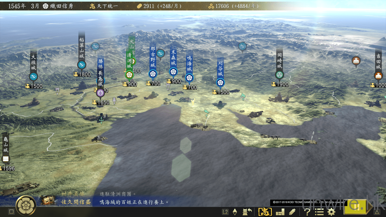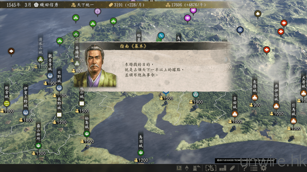 講完開箱,去到講番隻遊戲啦。今次《信長之野望:大志》去到此系列的第 15 集,在畫面上可說是繼承了上集《創造》的 3D 畫風元素,無論是大地圖或者戰場介面,都採用了 3D 立體地圖設計,從畫面已明顯看到山脈、平地、河流、海洋等地形,在策略遊戲層面來說,畫風算是做得不錯,不過講到立體效果,始終未去到令玩家嘆為觀止的地步,畢竟仔細度未算做得好好,是有待改進的。