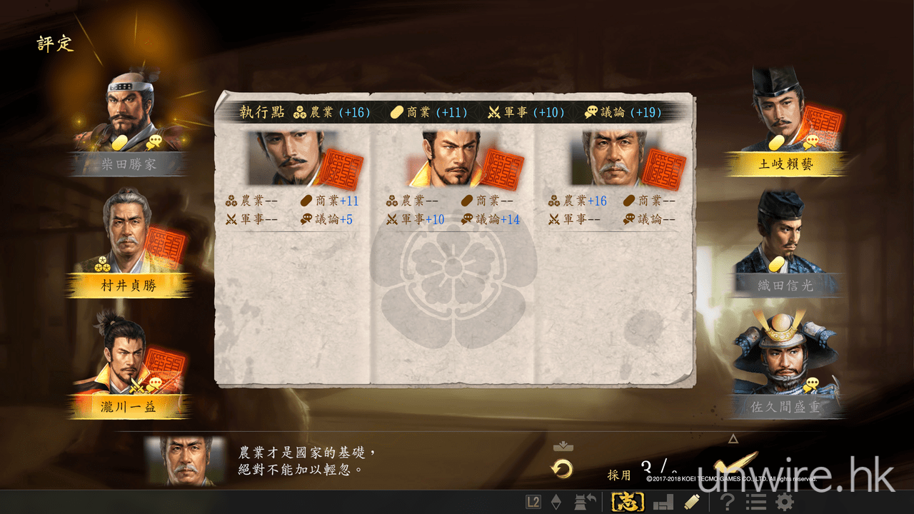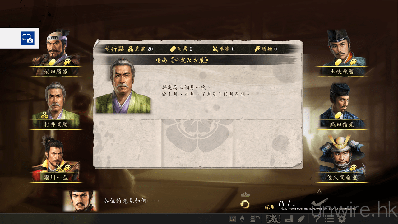 ▲在評定中,會有 6 個武將提出意見,只要採納了就可以獲得相對應的「執行點」。