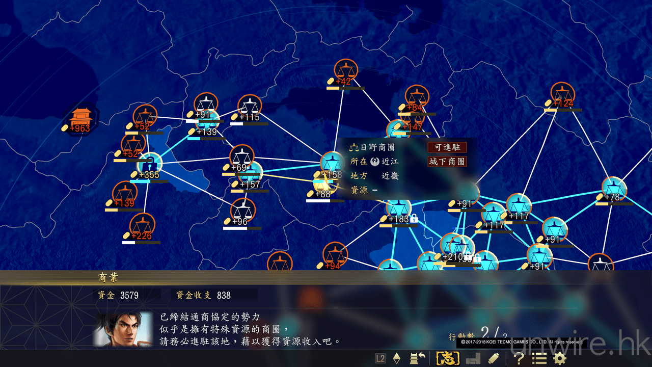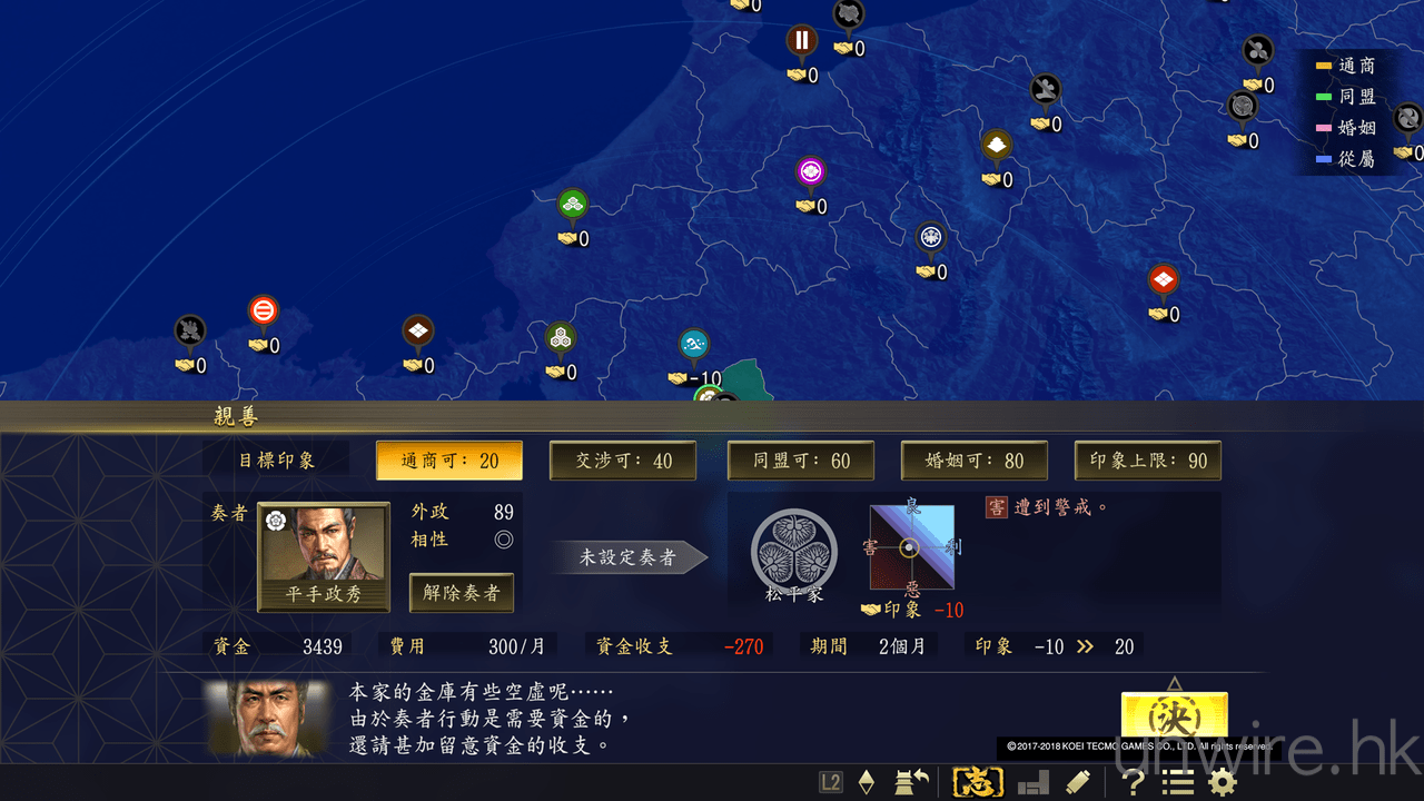 當然,大家可以進駐、投資自國據點的商圈,但要以軍事擴張的方法去擴展商圈,確實極無效率。所以,外交就變得十分重要了,因為只要印象值超過 20 就可以達成「通商協定」,然後就可以在其他大名國境內的商圈進行進駐及投資,這比消滅其他大名再建立自然的商圈來得更有效。