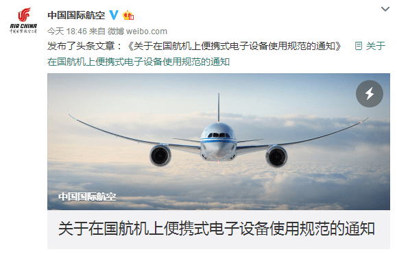 昨晚中國國際航空(國航)在官方微博宣佈,由 1 月 21 日零時開始,乘客可以在國航的航班上使用便攜式電子裝置。國航於微博發表《關於在國航機上便攜式電子設備使用規範的通知》,當中提到在飛機滑行、起飛爬升和接近著陸等關鍵時間,依然禁止使用便攜電子裝置。