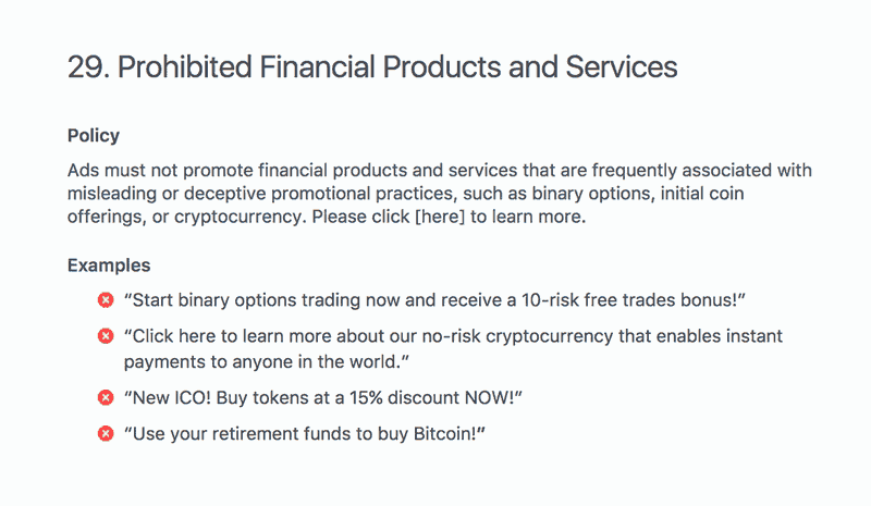 Facebook 的新廣告政策禁止公司或個人發佈跟欺騙、誤導有關的金融產品或服務廣告,Facebook 特別點名 ICO 和加密貨幣。Facebook 亦舉出不會獲批的例子,例如「以你的退休金購買比特幣!」和「新 ICO!現時購買代幣即享 15% 折扣」,Facebook 指現時太多公司營運時欠缺誠信導致他們作出上述的決定。