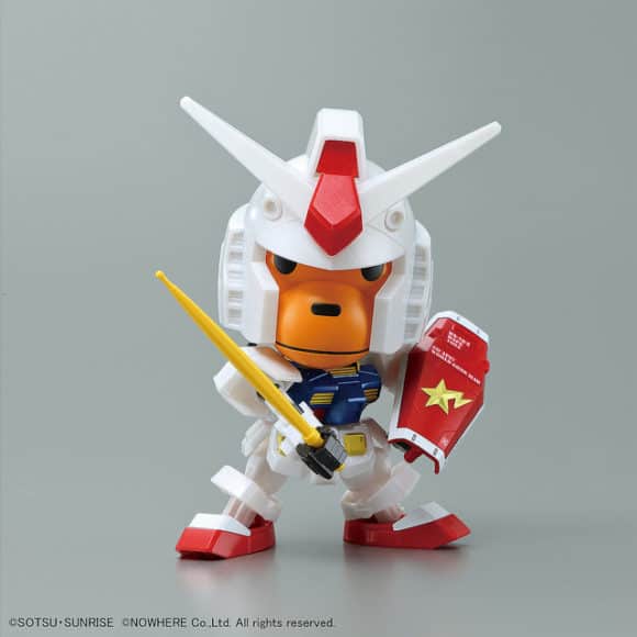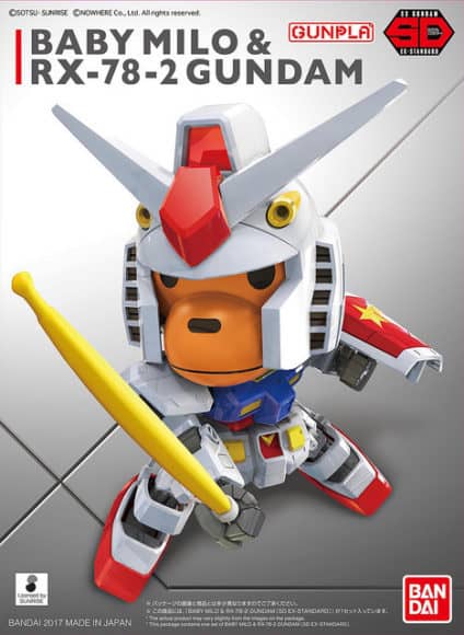 而猿人吉祥物「BABY MILO」也會變身成 RX-78-2 Gundam。今次 BABY MILO 會戴上 GUNDAM 頭盔,模型使用特殊金屬光澤成型色製作。用家更可把頭部交換到 SD GUNDAM RX-78-2 身上!本模型跟來限定版香蕉光束軍刀、香蕉光束步槍、BAPE STA 圖像的盾牌等,零件可與其他 Gundam 模型交換改造。Gundam 迷或者 AAPE 擁躉來說,這兩款模型都值得珍藏。