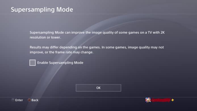 而 PS4 Pro 用家更新增超級採樣模式(Supersampling Mode)。透過這個系統,PS4 Pro 會將 4K 電視上呈現的畫面縮小到 1080p的HDTV 上,讓家中沒有 4K 電視的玩家,都可感受到視覺效果的提升。雖然部分擁有「PS4 Pro 增強」功能的遊戲已經搭載這個功能,但系統升級後,就能同時惠及本身不支援「PS4 Pro 增強」功能的遊戲。