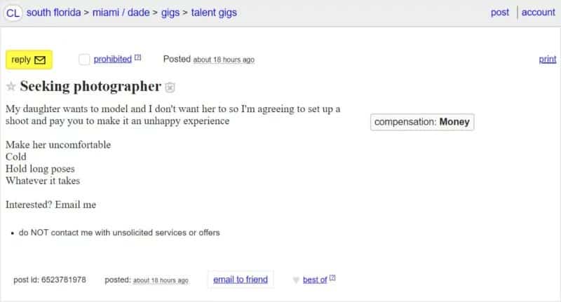 在香港如果女兒想做?模,作為父母的可能會格外擔心,原來在美國亦一樣,最近網民發現在南佛羅里達州的分類廣告網站 Craigslist,出現了一張奇怪的招聘廣告,有父母在 Craigslist 希望尋找可以讓女兒有不愉快攝影經驗的攝影師,好讓女兒打消當模特兒的念頭。