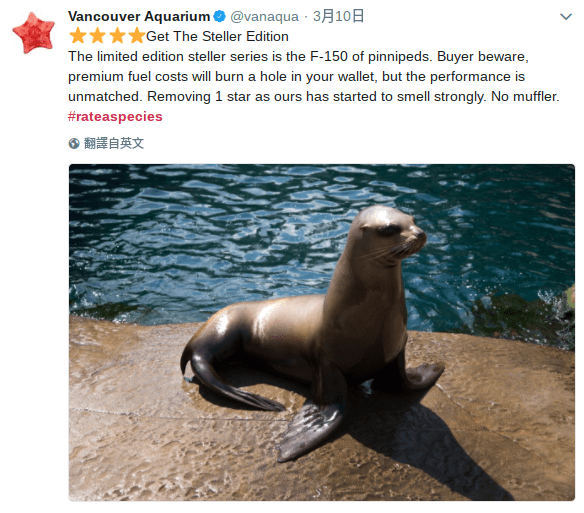 上週五美國俄勒岡州動物園的社交網站管理人員忽發奇想,發起 #rateaspecies 的活動,仿效網店為商品評分和評價的做法,在 Twitter 將園内動物給予「星星」評分和簡單評價。俄勒岡州動物園給予水瀨初步印象 4 粒星星,初步印象良好,表示牠擁有「堅固的結構」,完全防水和冬天合用,但只有啡色一種選擇。