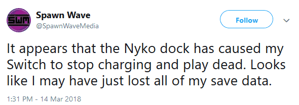 涉事的玩家都是使用 Nyko 出版的便攜底座,玩家投訴指韌體升級後 Switch 就停止充電和變磚。根據外國玩家苦主們的討論內容,除了 Nyko 外,相信還有其他的底座用戶在 Switch 升級後出事變磚。玩家們估計是任天堂在 5.0.0 版本韌體中加入保護機制,有比較幸運的玩家是主機升級後正常運作,但就無法辨認第三方底座配件。