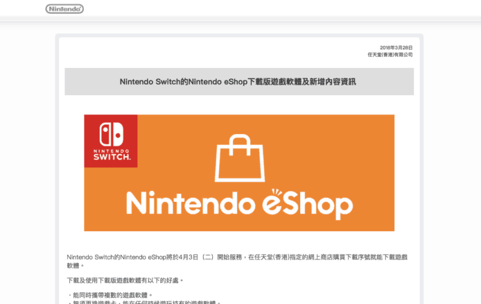 任天堂今日公布港版 Nintendo eShop 在 4 月 3 日正式投入服務之後,第一波可適用於 Nintendo eShop 的下載版遊戲與售價。留意玩家需要事先在網上商店購買遊戲的下載序號,然後到 Nintendo eShop 輸入序號,才能將遊戲加入到 Switch 主機。