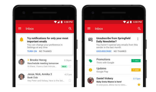 除了網頁版之外,Gmail App 亦得到更新,使用人工智能演算法,根據用戶以往的數據,為用戶計算出重要度較高的電郵,並將之優先顯示於列表的上方。此外如果用戶經常忽略某個寄件者發送的電郵,Gmail 會詢問用戶是否把這個寄件者的電郵取消訂閱。