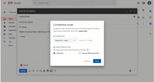 對於企業用戶,Gmail 新增「加密模式」,在寄出電郵的畫面中,會加入一個小鎖頭,令信件加入期限,讓收件者只能在指定的時間內,閱讀此郵件的內容。另外亦可指定收件者無法轉寄、複製、下載或列印信件。