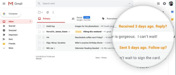 Google 旗下的 Gmail 電郵服務推出更新版本, 除桌面版介面更新,帶來側邊欄與更方便電郵下載附件的新顯示模式外,更有電郵回覆提示、危險電郵加強提示,Gmail 手機 App 會使用人工智能演算法利用過去的數據,把對用戶較重要的電郵排列於較上方位置。