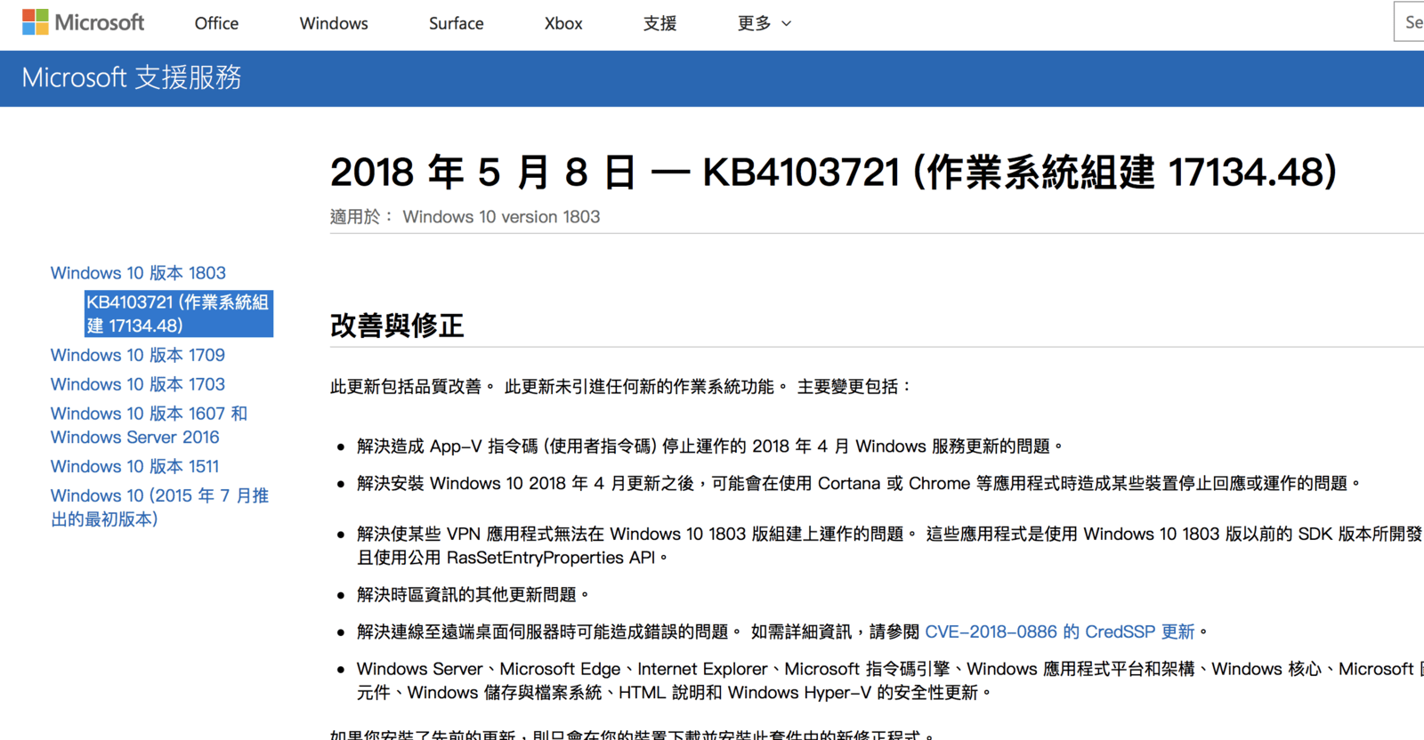微軟Windows 10修正檔「KB4103721」說明網頁:https://support.microsoft.com/zh-hk/help/4103721/windows-10-update-kb4103721