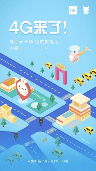 小米在官方微博上發出一張預告圖片,指出「4G來了!通話無卡頓,定位更迅速,它是___?」,這項「米兔新產品」將會於 7 月 23 日早上 10 時正式發佈。米兔是小米旗下以兒童為對象的智能產品品牌。