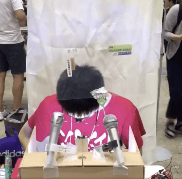 在名人出席「記招」時,只要他們一低頭道歉,在場的記者們便會連環按快門,導致場上閃光燈閃個不停,還有嘈雜的快門聲。「記者會模擬器」就是為了模仿這個場面而設計的。連接機器的麥克風底部設有距離感應器。只要使用者在機器前面低頭,閃燈就會自動亮起,還會播出「咔嚓咔嚓」的快門聲,讓一般人一嘗當名人的滋味。「自助記者會機器」由北九州工業大學畢業生組成的「NEXT+α」設計,歷時 3 個月。