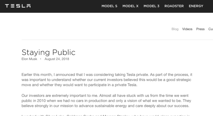 Tesla CEO 馬斯克 (Elon Musk) 早前一直發消息期望公司私有化,更有傳聞他曾與中東資本洽談。然而馬斯克在其公司官方網站發表訊息,指通過與財務顧問、股東作多方面的意見交流之後,發現 Tesla 保持在股票市場上市,才是最好的選擇。意味著他會放棄公司私有化的計劃。