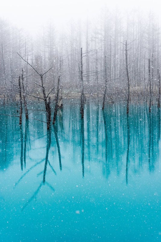 這裡是北海道上川郡美瑛町被稱為「藍池」的湖泊,不少攝影發燒友都希望在此拍攝大雪與天然藍色水面結合的大自然美景,最近大雪飄來,攝影愛好者當然也沒有錯過。「藍池」是當地防止土砂災害而建設的堤壩所造成一個人工池。據說由於附近噴出的泉水裡面含有氫氧化鋁的微粒子,令到水面產生天然的藍色。這個景點在 1997 年被攝影家發現而成名,而 Apple 產品在 2012 年開始把這個風景的相片輯錄在背景圖片集。