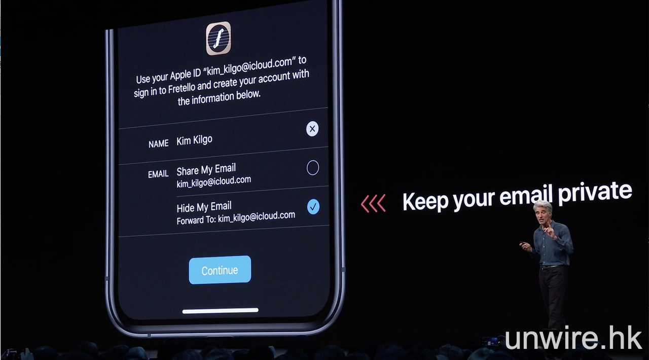iOS 13 在用家私隱保護上亦作出了很大改進,以往不少第三方 APPS 均支援以社交媒體進行登入,例如:Facebook、Google 帳戶等,但在 iOS 13 中,Apple 就引入 Apple 登入這個系統,用家只需要使用 Face ID,就可以登入不同軟件,換言之不用記憶不同的登入密碼,登入不同軟件自然更方便,而且由於用家的密碼或登入資料不會儲存在 Apple 伺服器,自然亦不會出現私隱洩漏問題。另外,以 Apple Sign-in 登入 APPS 時,用家更可選擇不向 APP 開發者透露自己的真身電郵,當選擇了該選項時,iOS 13 會自行隨機產生一個假電郵地址進行登記,而且每個軟件也會有它自己的隨機產生電郵,這樣就可進一步保障用家私隱。