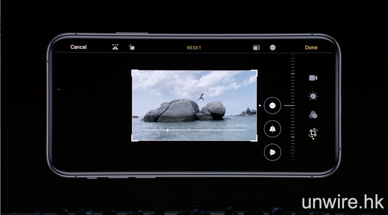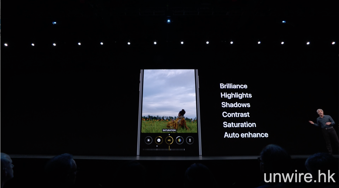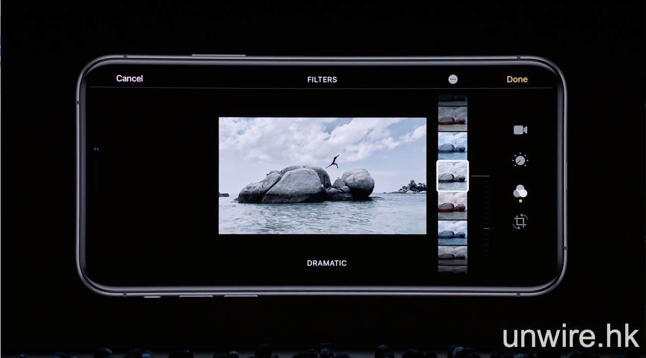 至於拍照功能方面,iOS 13 亦有新增功能,首先人像模式中加入了全新的 Hi-Key 黑白模式,令用家能拍出更有型的黑白人像相片。此外,照片程式的介面亦改善了,令用家能按日、月及年瀏覽精彩相片。此外,照片編輯亦更容易使用,只需要一點一拉,就可以進行修圖,Apple 更首次將這個編輯功能應用在影片中,令用家能更簡單在同一個軟件中,進行簡單的影片編輯,包括:旋轉影片顯示方向(即是由直度轉為橫度)、加入不同風格的濾鏡等。