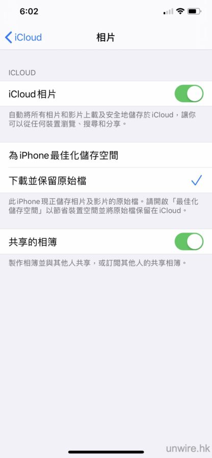 在相片選項頁中,剔選「iCloud相片」,你的手機相片將會上傳到 iCloud 伺服器作備份。留意你的 iCloud 是否有足夠空間存放你的相片,你有可能需要訂閱 iCloud 儲存空間。