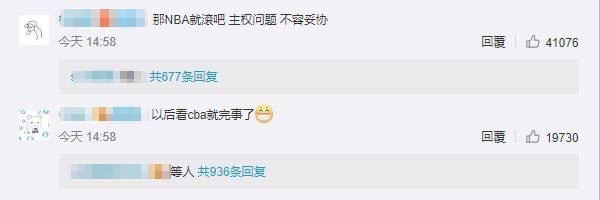微博留言可謂一面倒支持央視決定,更指 NBA 已侵犯了中國的國家主權,得罪了中國,也沒必要賺中國的錢,指以後只看 CBA 就足夠。